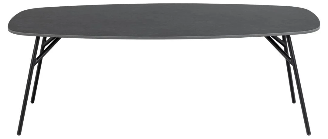 Strakke salontafel met rechthoekig zwart Cupa keramisch blad (12 mm, ruw) en 4 mat zwarte, gepoedercoate stalen poten met kunststof voetdoppen. 120×60×41 cm, verstelbaar 40,5–41 cm. Draagvermogen 20 kg. Duurzaam, onderhoudsarm en snel te monteren. Bestel nu!