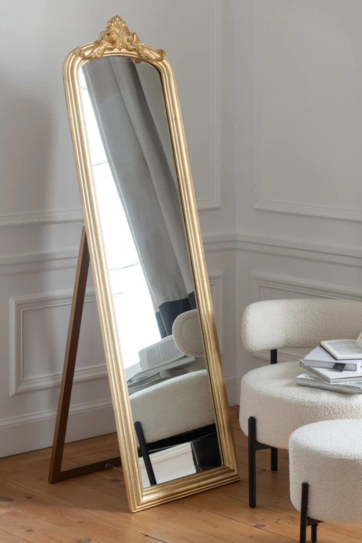 In een lichte slaapkamer biedt deze staande spiegel goed zicht van top tot teen. De goudkleurige lijst voegt subtiel karakter toe en het houten frame voelt stevig aan. Door het formaat is verplaatsen lastig. Ideaal voor wie stijl en functionaliteit zoekt.