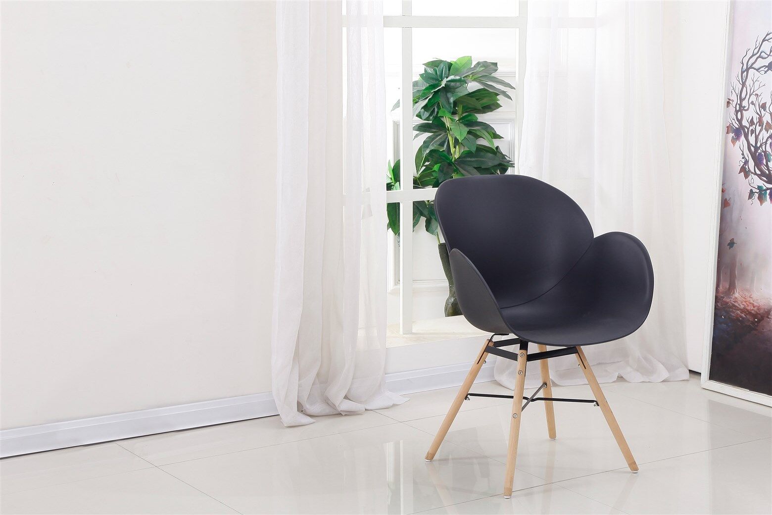 Materiaal: zitting polypropyleen; onderstel ijzer; poten beukenhout. Onderhoud: afnemen met zachte, vochtige doek; vlekken plaatselijk reinigen. Afmetingen: zithoogte, totale hoogte, breedte en diepte — zie specificaties. Kleur: zwart. Herkomst: China. Goed te combineren met eettafels, banken of een gemixte stoelenset; ook mooi met bijpassende barstoelen.