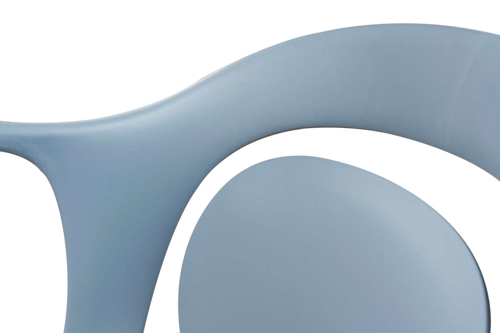 Steunende rondingen, een stevig frame en een zitvlak dat je meteen uitnodigt. De grijsblauwe kuip in polypropyleen rust op beukenhouten poten met metalen drager—modern, solide en gemaakt voor dagelijks tafelen.