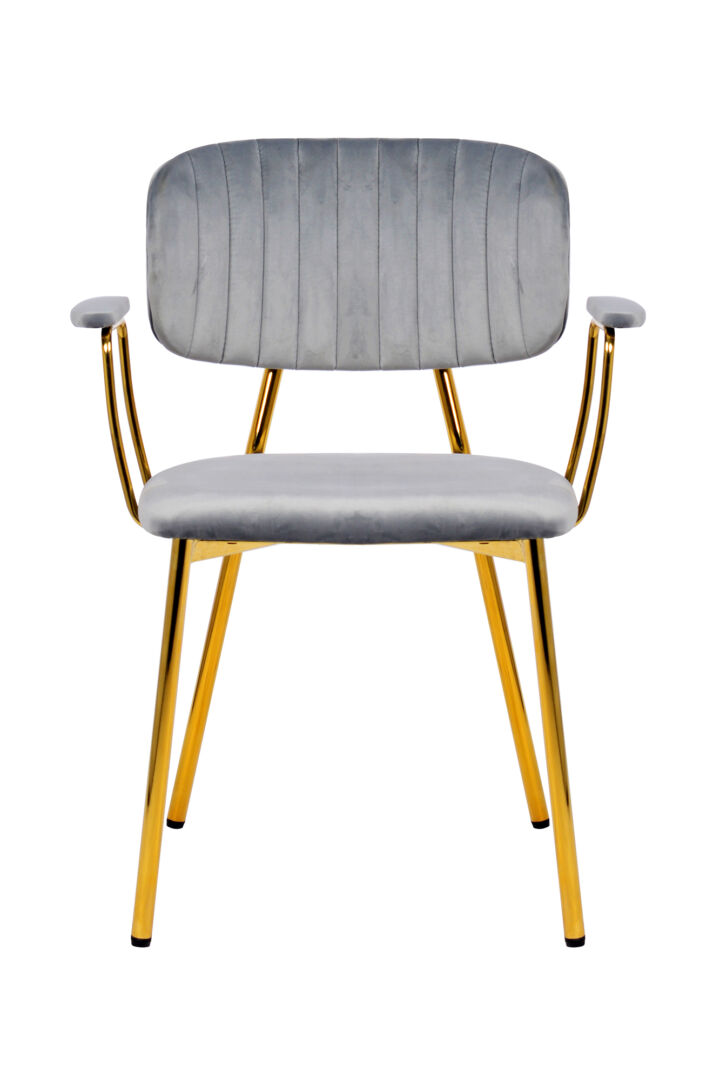 Schone lijnen. Eerlijke materialen. Moeiteloze ontspanning bij elke gang: een comfortabele eetstoel met armleuningen in pastelgrijs fluweel op een slank, goudkleurig frame met glamoureus accent.