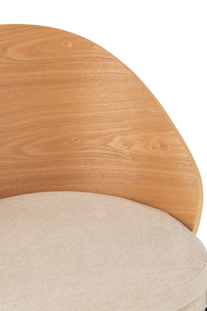 De natuurlijke mix van multiplex en beige textiel voelt warm aan, terwijl het metalen onderstel elke beweging zeker opvangt. Past moeiteloos bij je tafel, groot of compact.