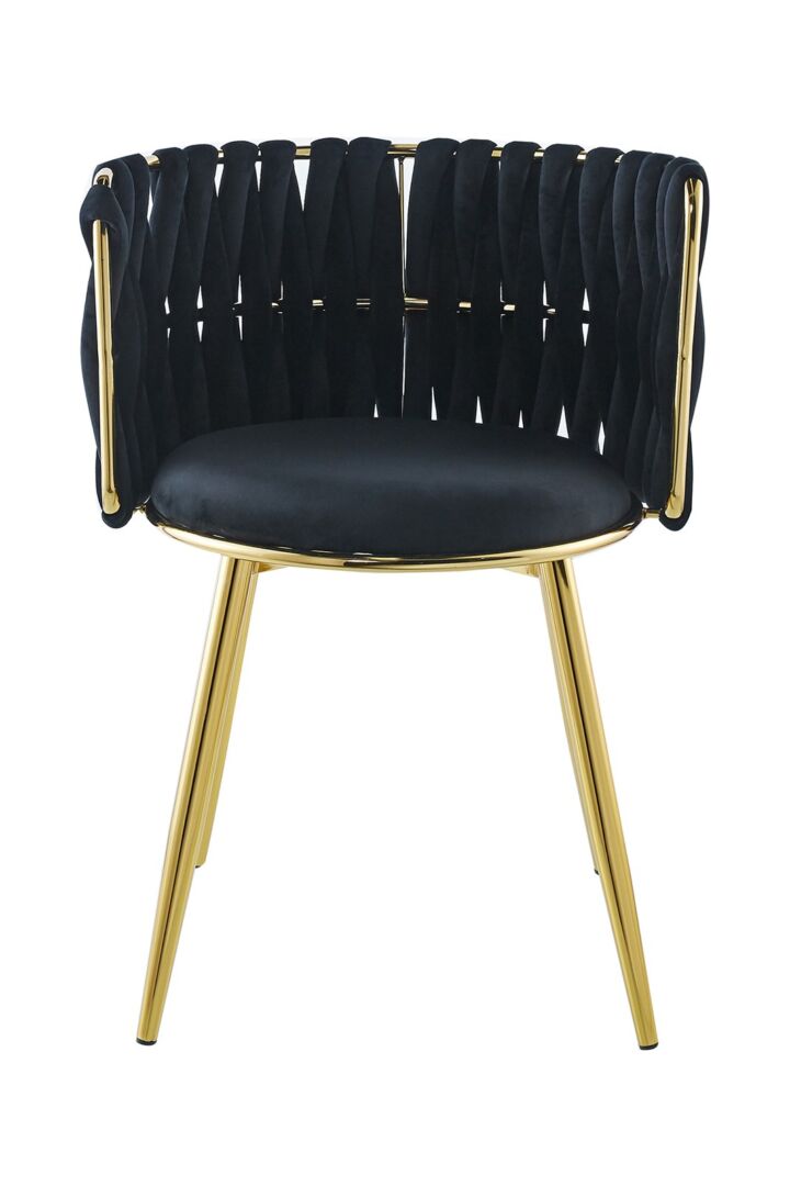 Deze eetkamerstoel verenigt fluweelzachte bekleding in diep zwart met een gevlochten rug en een ronde, gepolsterde zitting. Slanke poten van 100% ijzer vormen een elegante, stabiele basis voor keuken, eethoek of lounge.