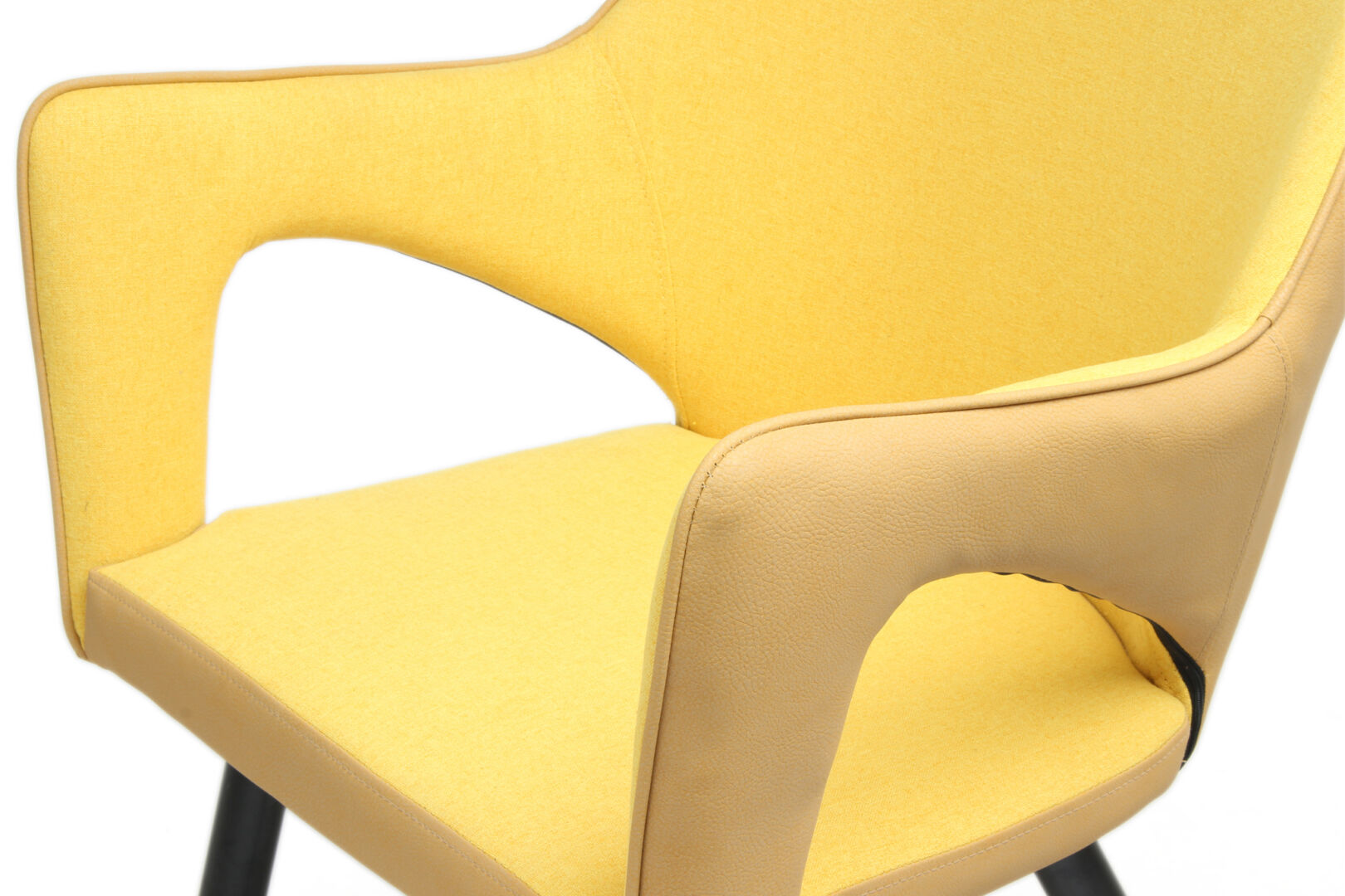Bij het avondeten bieden deze gele eetkamerstoelen comfortabele steun dankzij de ergonomische rug en armleuningen. De combinatie van zachte stof en lederlook oogt modern. De zitdiepte is minder geschikt voor langere mensen. Ideaal voor wie compact en stijlvol wil zitten.