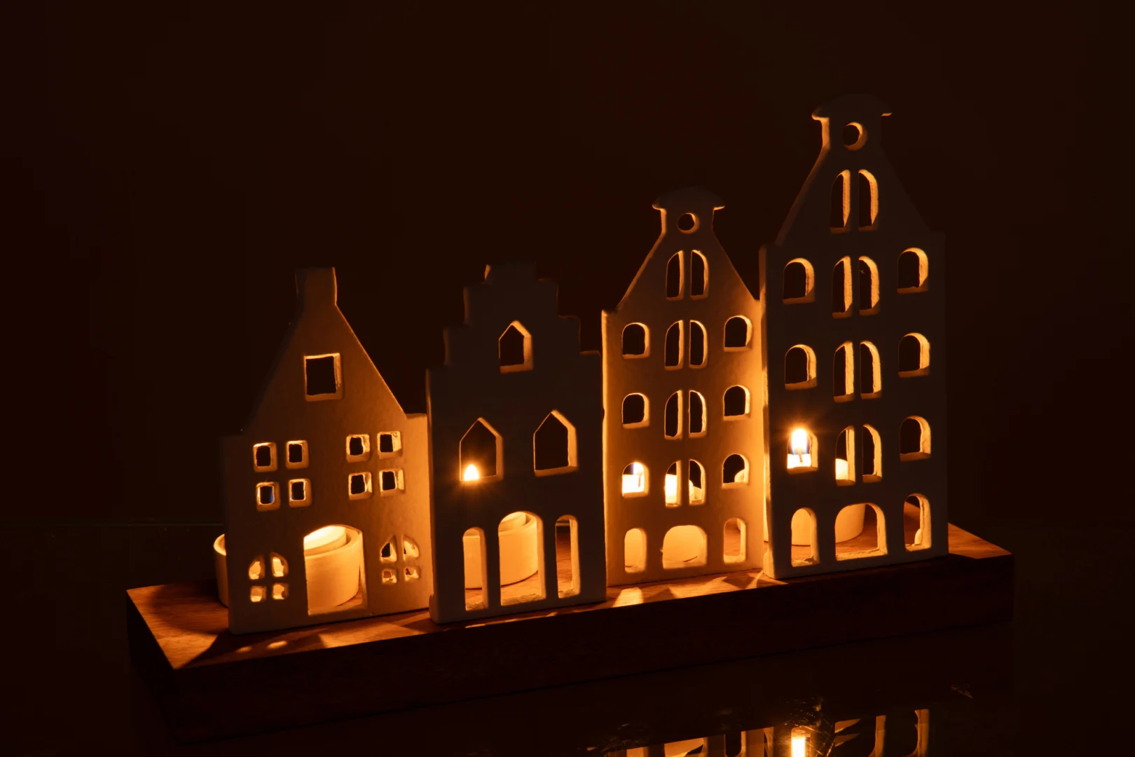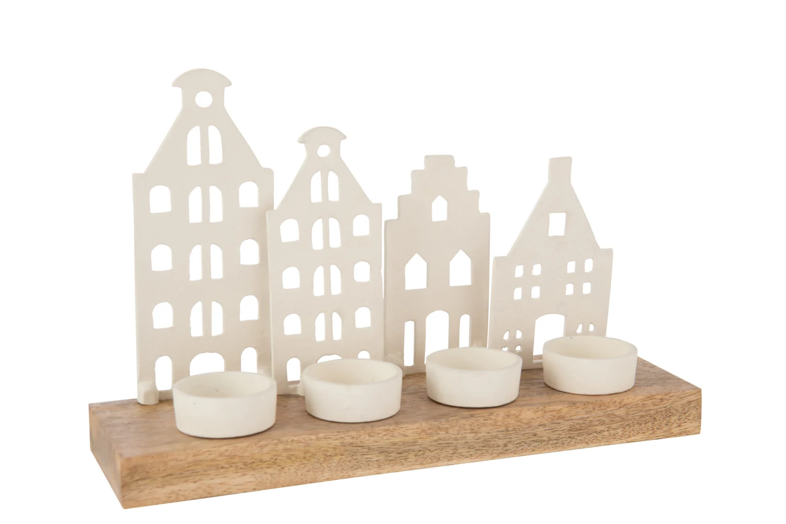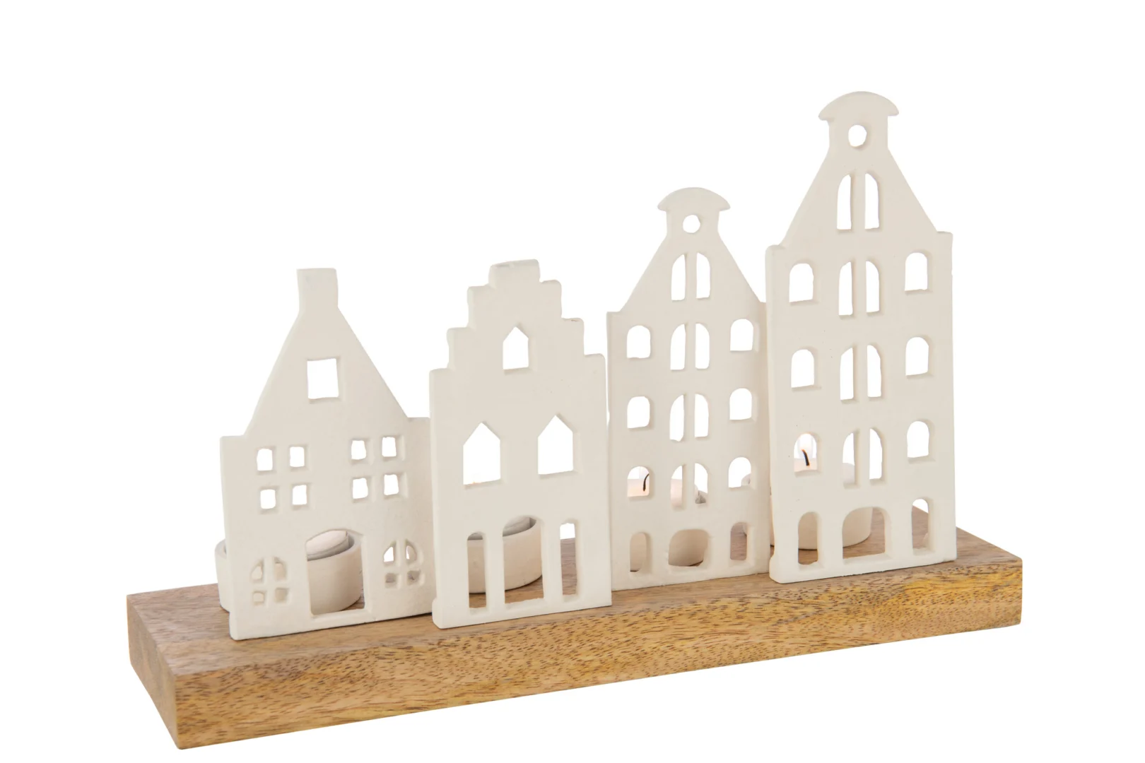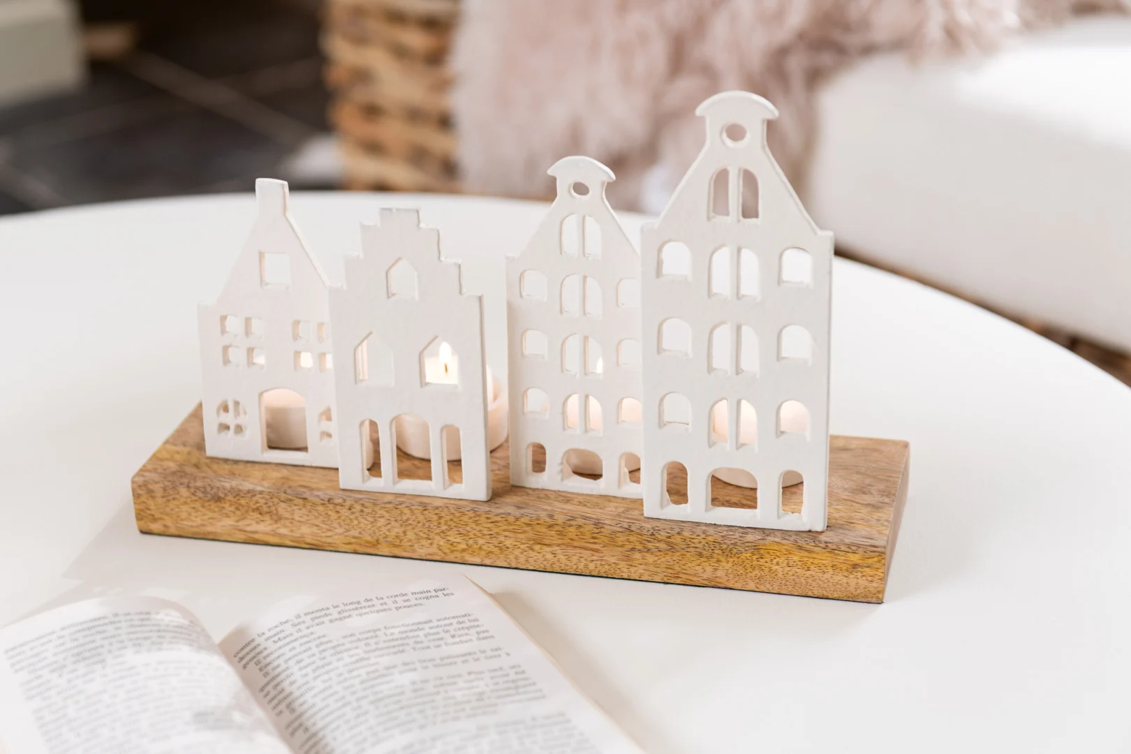 Deze theelichthouder combineert strak wit met warm hout, sfeervol maar minder stabiel op ongelijke oppervlakken. Geschikt voor rustige interieurs.