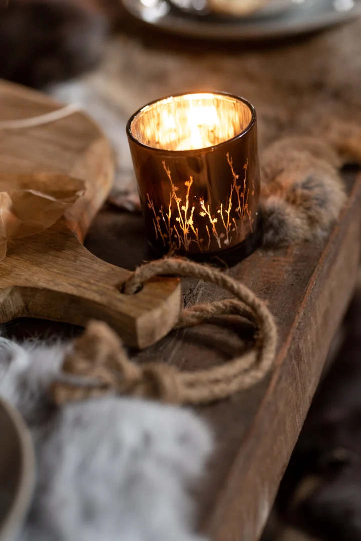 Deze glazen theelichthouder creëert sfeervol licht op een salontafel of vensterbank. Het warme bruine glas geeft een zachte gloed en het lichte gewicht maakt verplaatsen makkelijk. De kleine maat beperkt het gebruik tot kleinere kaarsjes. Geschikt voor sfeerliefhebbers.