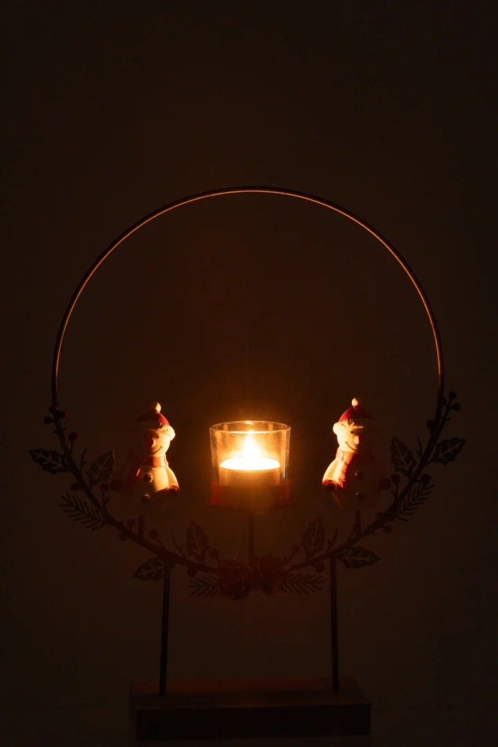 Theelichthouder Cirkel Op Voet Sneeuwmannen Mix is een feestelijke kandelaar met twee sneeuwpoppen in sjaals en mutsen, dennenappels, hulstbladeren en bessen op een cirkelvormig metalen frame met houten voet en centrale glazen houder.