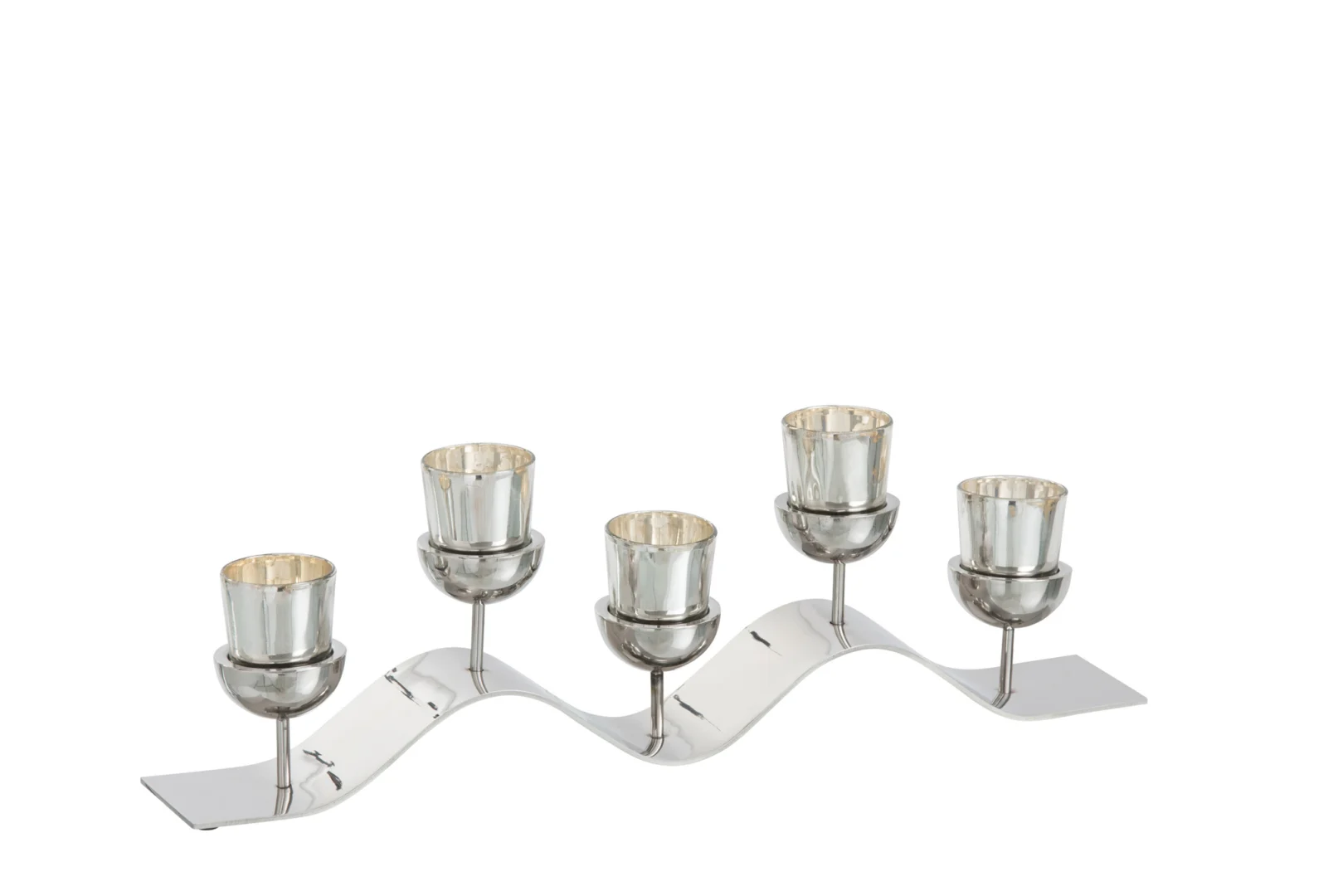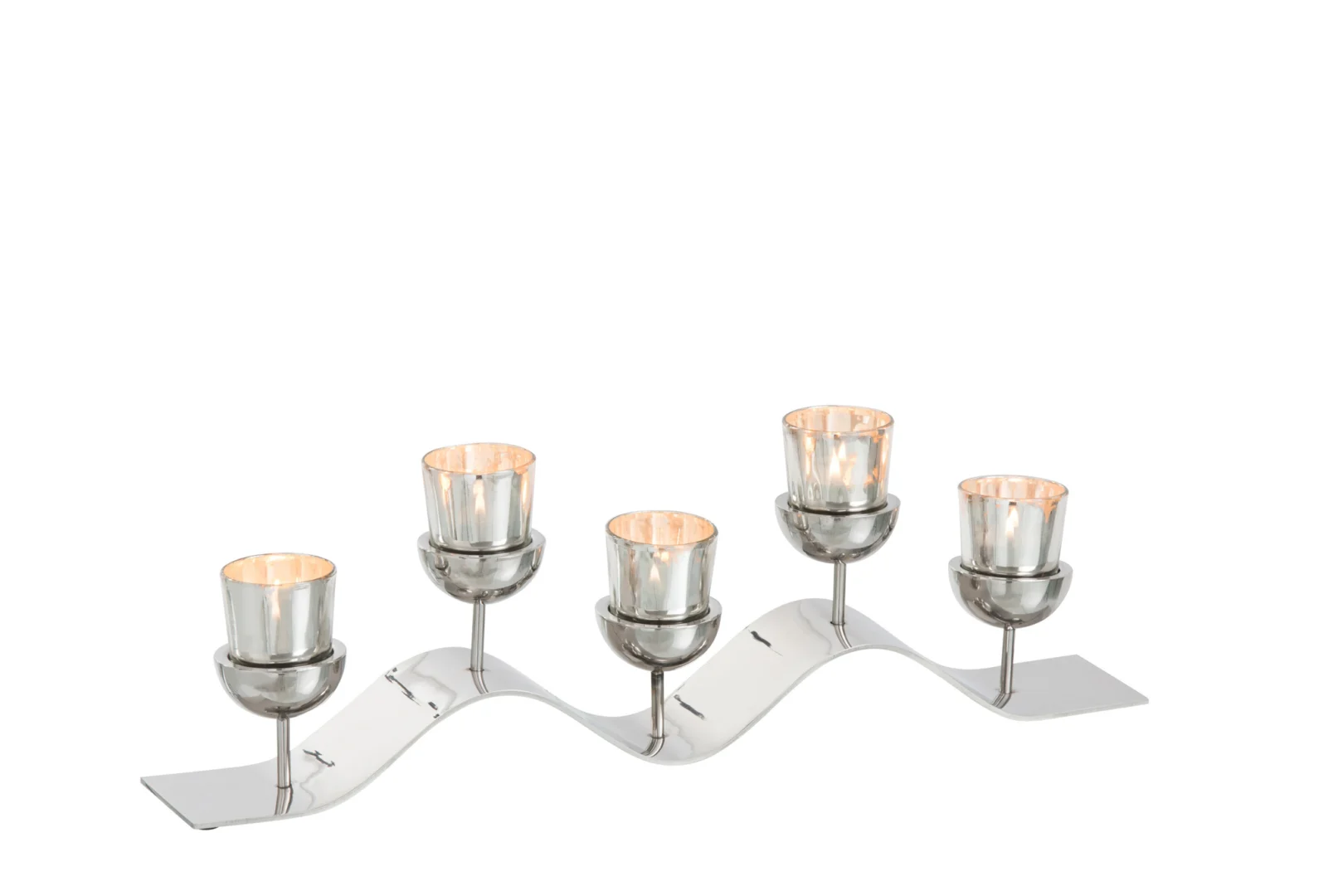 Creëer direct sfeer met meerdere theelichten of smalle stompkaarsen. Het smalle profiel neemt weinig ruimte in, waardoor je tafel vrij blijft voor servies en decoratie. De reflecterende zilverkleur versterkt de warme gloed voor een luxe uitstraling, zowel modern als klassiek.