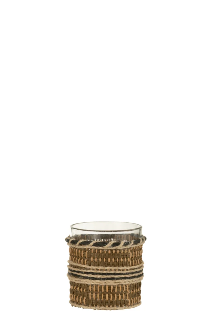 Breng meteen warmte in huis met deze bruine kaarsenhouder. Het compacte design van glas met natuurlijke papier- en juteaccenten zorgt voor een gezellige sfeer op tafel, dressoir of vensterbank.