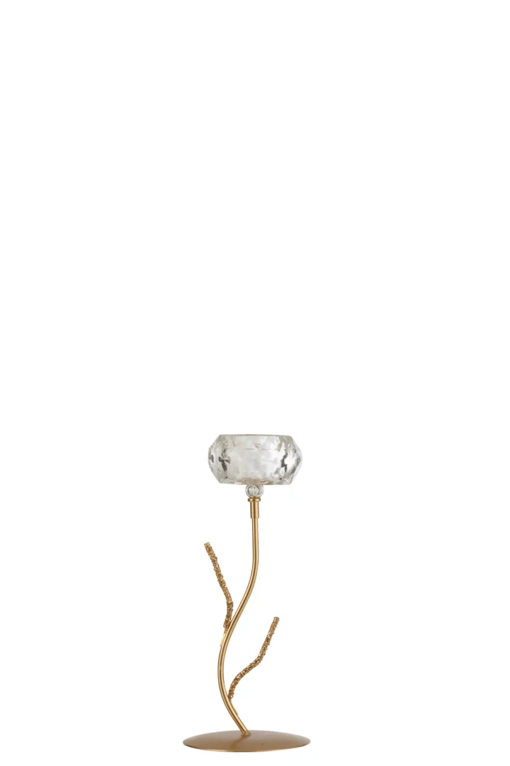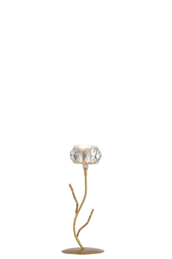 Deze theelichthouder in gouden afwerking straalt niet alleen luxe uit, maar creëert ook een gezellige ambiance in iedere ruimte. Perfect voor op tafel tijdens diners of als aanvulling op je woondecoratie, deze kaarsenhouder voegt een vleugje elegantie toe aan elke gelegenheid. Begeleid door het zachte licht van een kaarsje, wordt je interieur omgetoverd tot een warm en uitnodigend geheel.