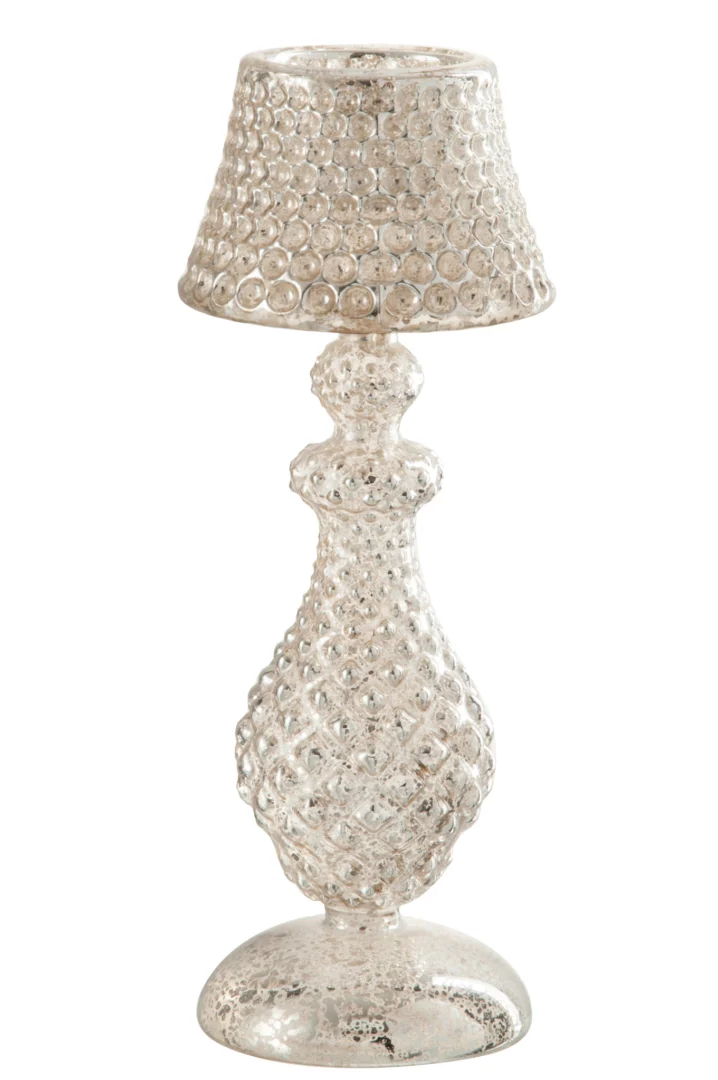 Ontdek een elegante zilverkleurige glazen kaarsenhouder van J-Line (Zomer 2018). 100% glas, hoogte 28 centimeter, basis 10,5 bij 10,5 centimeter, gewicht 0,16 kg. Sfeervol op tafel, dressoir of vensterbank; ideaal met stomp- of LED-kaarsen.