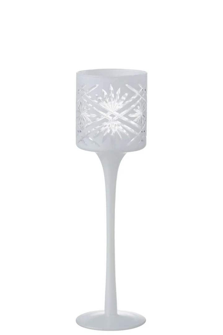Breng warmte en stijl in huis met deze slanke kaarsenhouder van helder wit glas. Met een hoogte van 25 cm voegt hij direct een elegant accent toe aan elke setting.