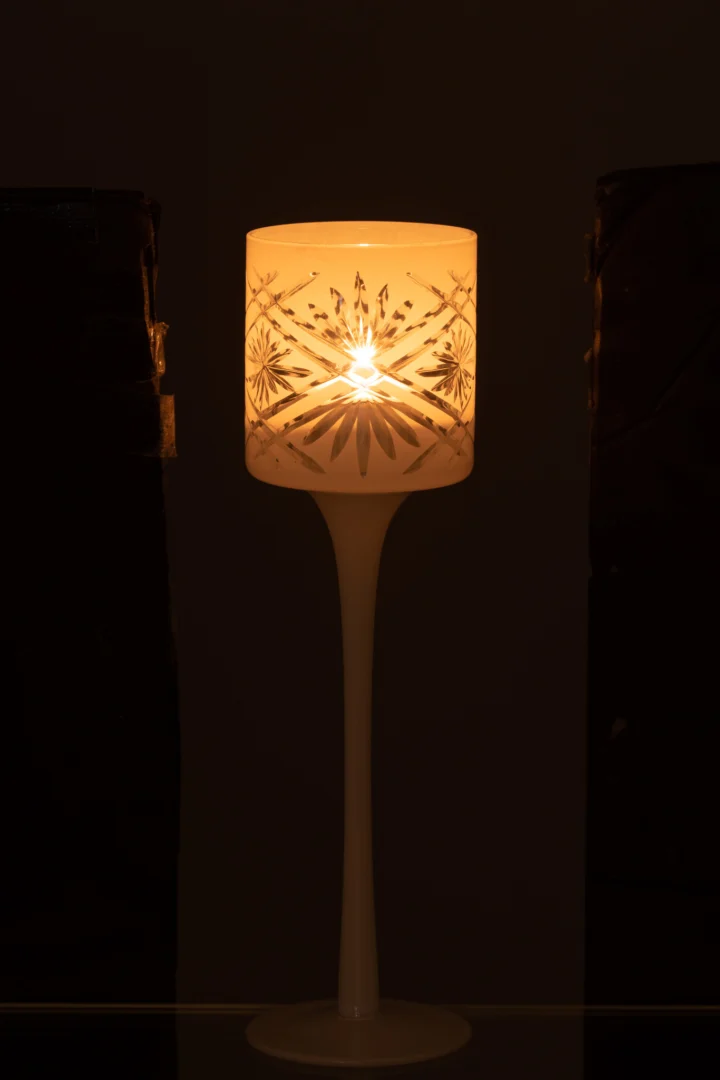 Materiaal en verzorging: 100% glas in wit. Reinig met een zachte, droge of licht vochtige doek; niet geschikt voor de vaatwasser. Plaats op een hittebestendig, stabiel oppervlak en buiten bereik van kinderen en huisdieren. Levertijd: 2-3 dagen.