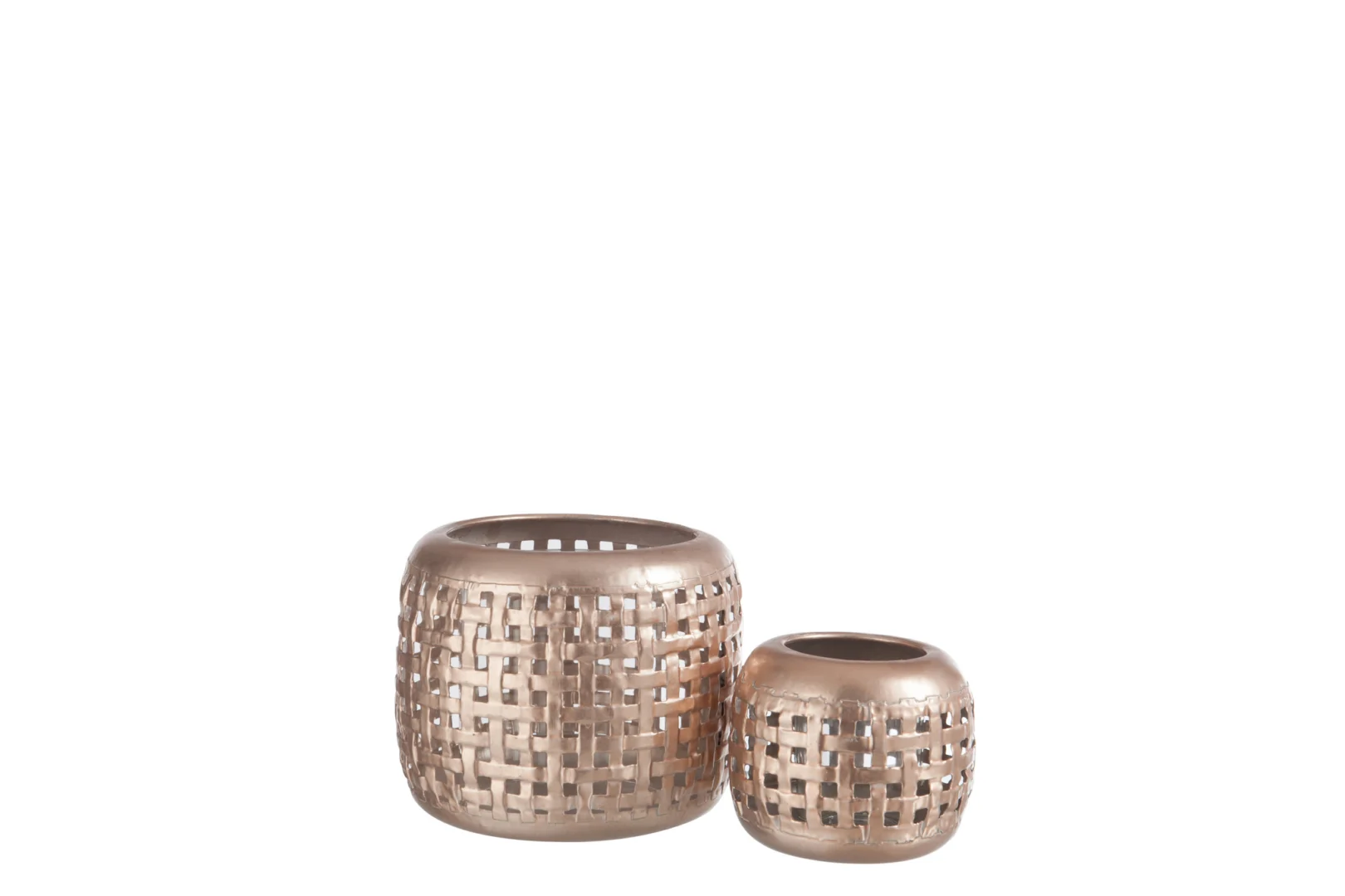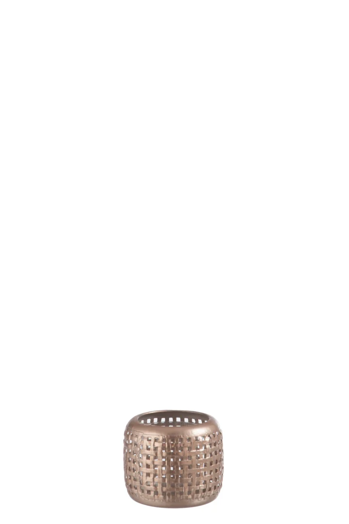 Deze theelichthouder geeft zacht licht tijdens een diner of ontspannen avond. De koperkleurige afwerking en metalen rooster zorgen voor een warme uitstraling. Minder geschikt voor buitengebruik door het lichte gewicht. Ideaal voor liefhebbers van stijlvolle interieuraccenten. Prima keuze.