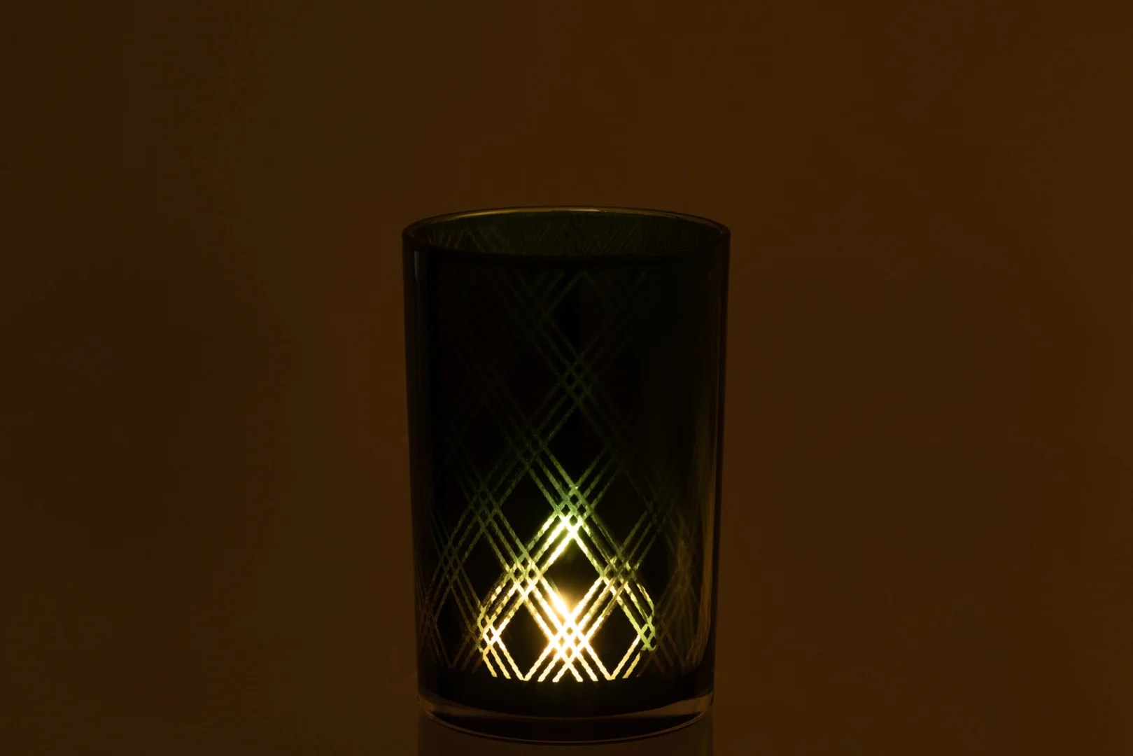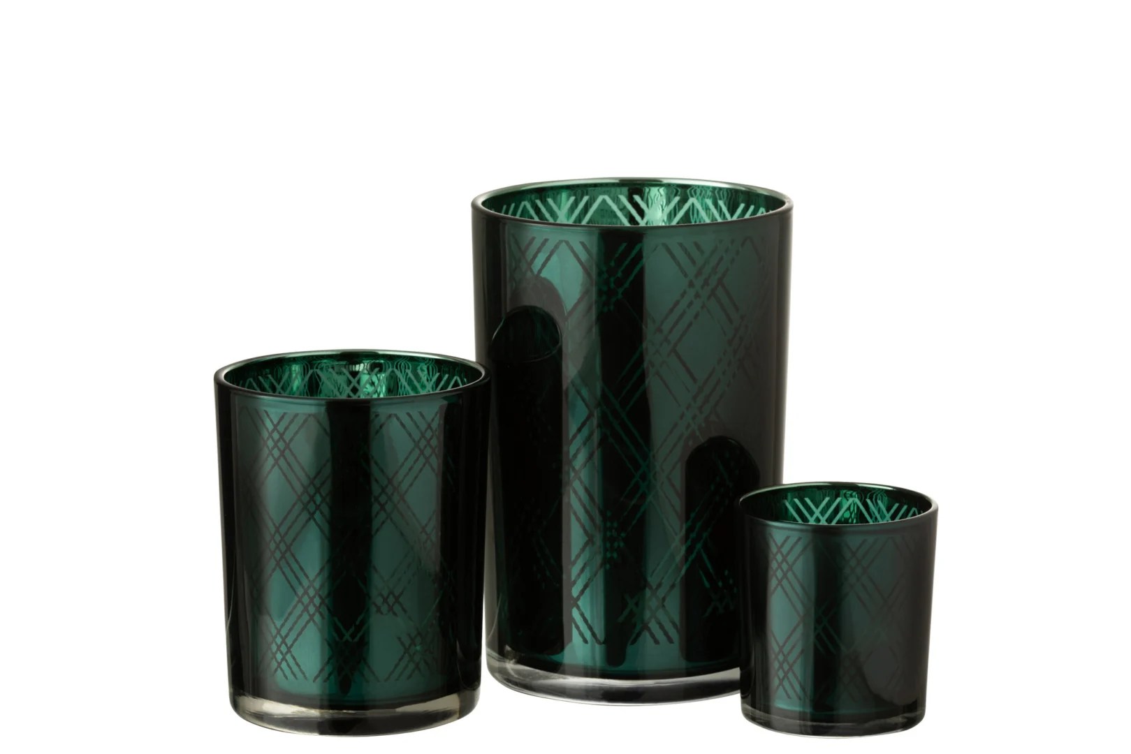 Theelichthouder Ruit Glas Groen Groot tegen een effen witte achtergrond, met donkergroen glas en een subtiel kriskraspatroon.