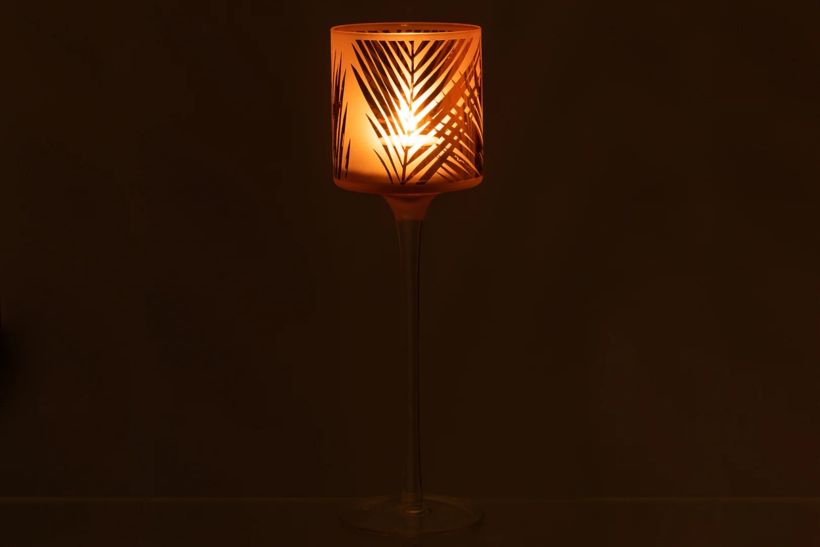 De Theelichthouder Safari Glas Beige Op Voet Groot is een hoge kandelaar met een heldere slanke steel en een beige cilindrische glazen bovenkant geëtst met een bladmotief.
