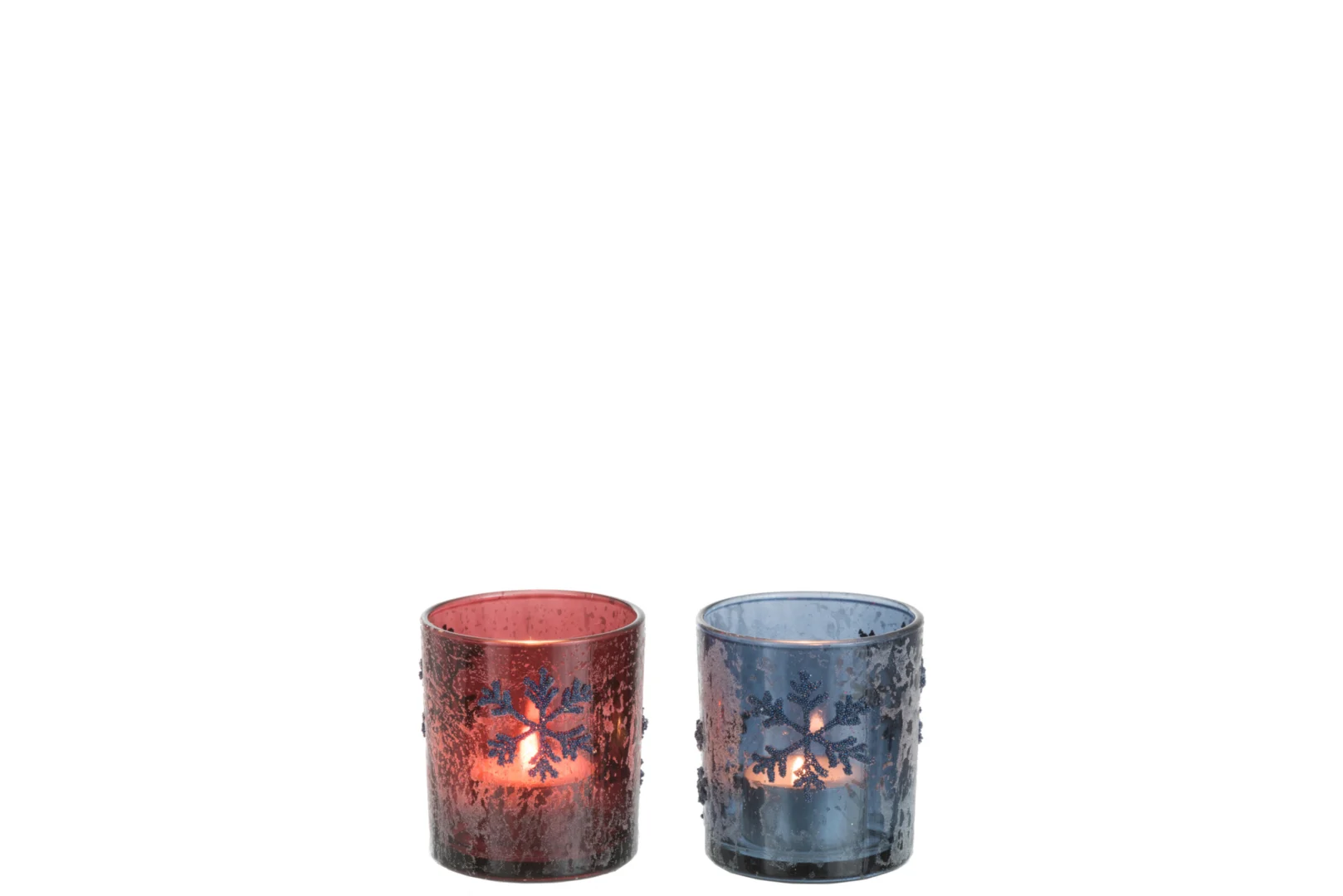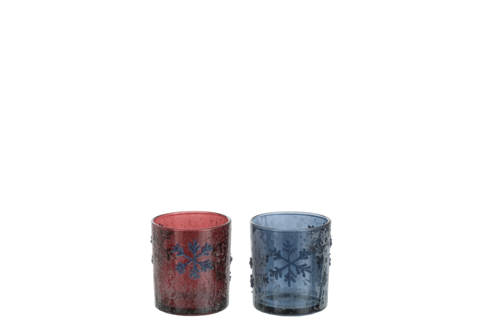 Theelichthouder Sneeuwvlok Glas Blauw Rood Klein Set 2