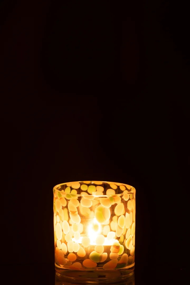 Theelichthouder Spots Glas Mix: een glazen houder met een mix van groene, gele en oranje stippen verspreid over het oppervlak op een witte achtergrond.