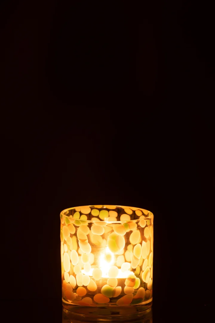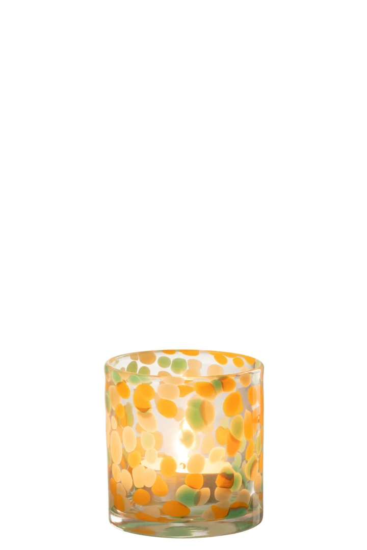 Breng direct warmte en kleur in huis met deze glazen kaarsenhouder in een speelse mix van tinten. Het compacte formaat van 10 x 10 x 10 cm maakt hem ideaal voor elke ruimte, van vensterbank tot salontafel.