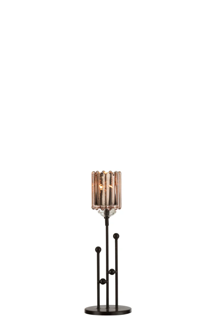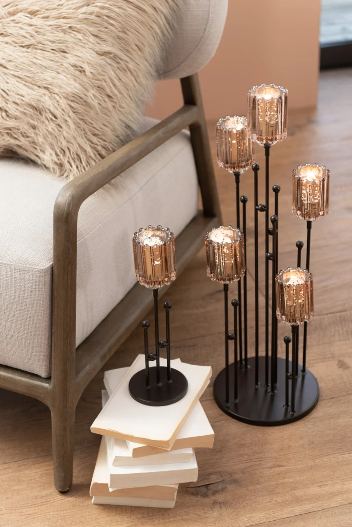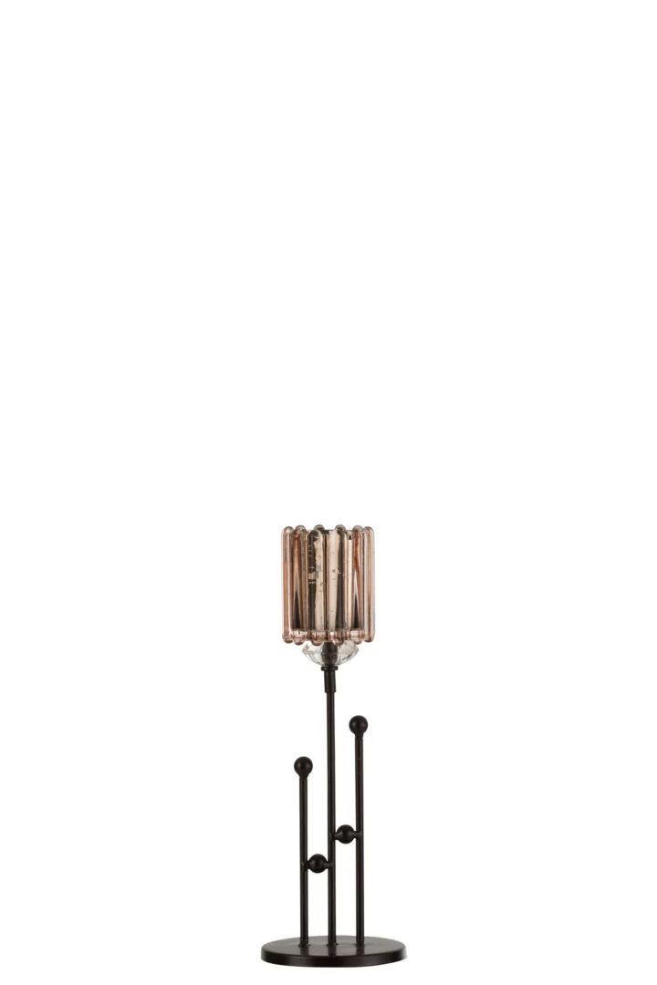 Deze sfeervolle theelichthouder komt mooi tot zijn recht op een gedekte tafel of smalle vensterbank. De combinatie van warmbruin glas en zwarte metalen accenten oogt stijlvol en modern. De constructie voelt stevig aan. Minder geschikt voor buitengebruik. Ideaal voor liefhebbers van subtiele decoratie. Een smaakvolle toevoeging voor elk interieur.