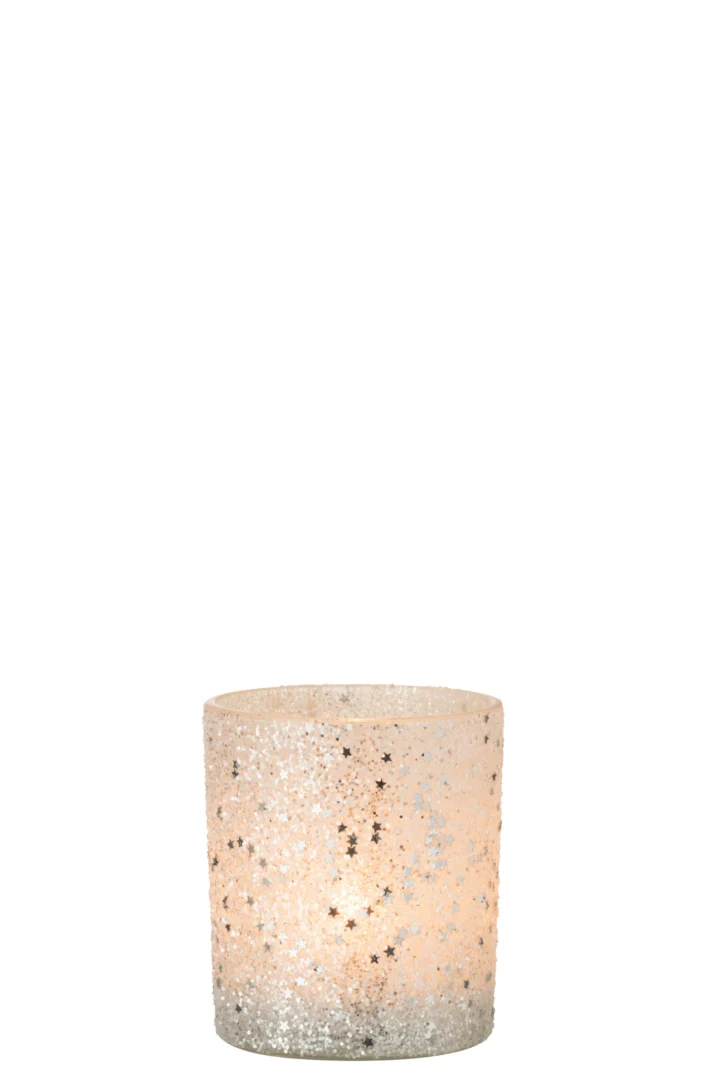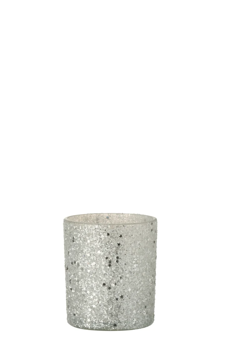 Breng direct warmte en glans in huis met deze zilverkleurige kaarsenhouder van glas. Compact, stijlvol en perfect om elke ruimte een gezellige sfeer te geven, van vensterbank tot feestelijk gedekte tafel.