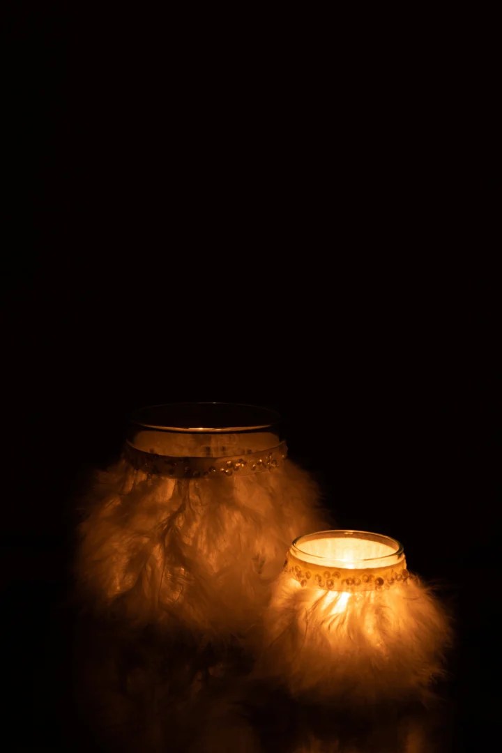 Het halftransparante glas verzacht het kaarslicht tot een warme, diffuse gloed, terwijl de veerafwerking een speels en luxe accent toevoegt. Mooi op de eettafel, vensterbank of salontafel, solo of in een setje. Ook leuk als cadeau voor een sfeerliefhebber.