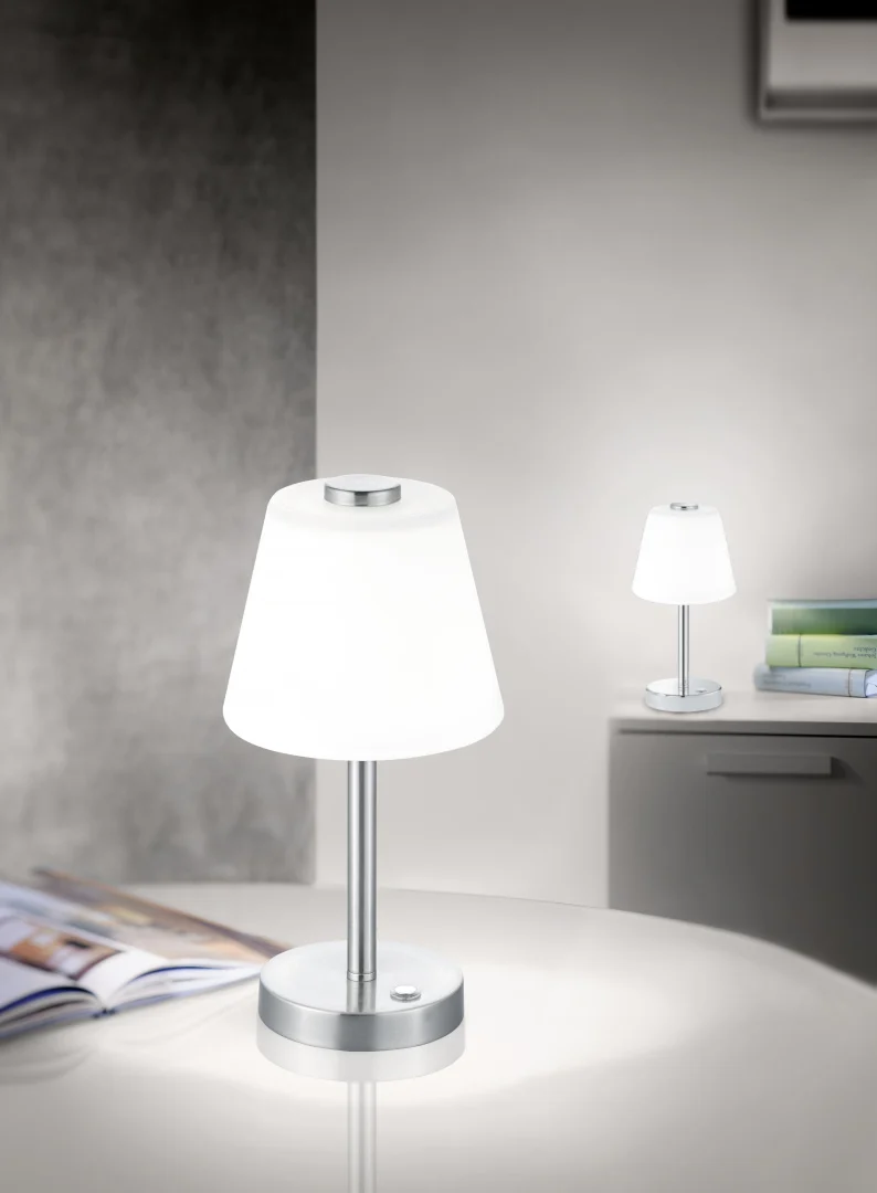 Deze tafellamp geeft een helder maar zacht licht, ideaal voor op een nachtkastje of leeshoek. De combinatie van mat nikkel en wit glas oogt modern en neutraal. De vaste LED is energiezuinig maar niet vervangbaar. Prima keuze voor minimalistische interieurs.