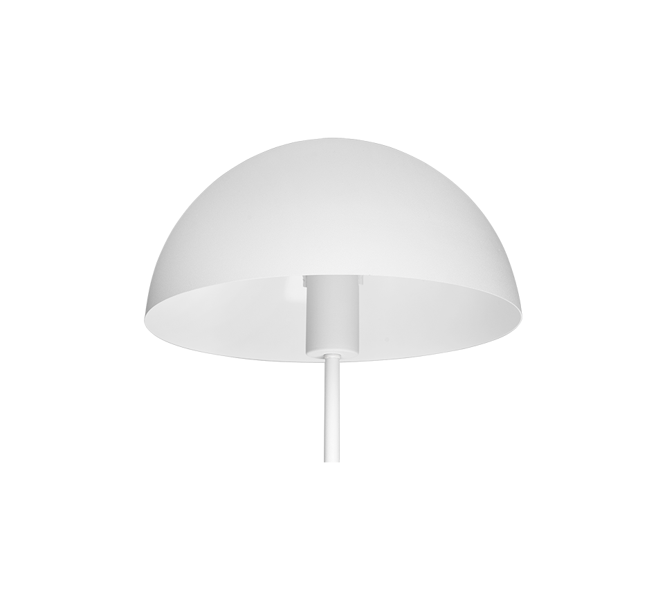 A: De lamp is van hoogwaardig metaal in mat wit, Ø 30 cm en H 45 cm, met een puristisch paddenstoelvormig design dat moeiteloos past op een nachtkastje, dressoir of side table in moderne en klassieke interieurs.