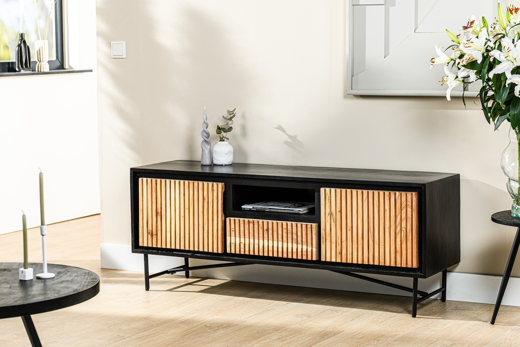 In een compacte woonkamer biedt dit tv-meubel voldoende plek voor een middelgrote televisie en opbergruimte voor randapparatuur. Het massieve acaciahout oogt warm, de stalen poten zorgen voor stabiliteit. Minder geschikt voor grotere audiovisuele opstellingen. Ideaal voor stijlzoekers met beperkte ruimte. Aanrader voor minimalistische interieurs.