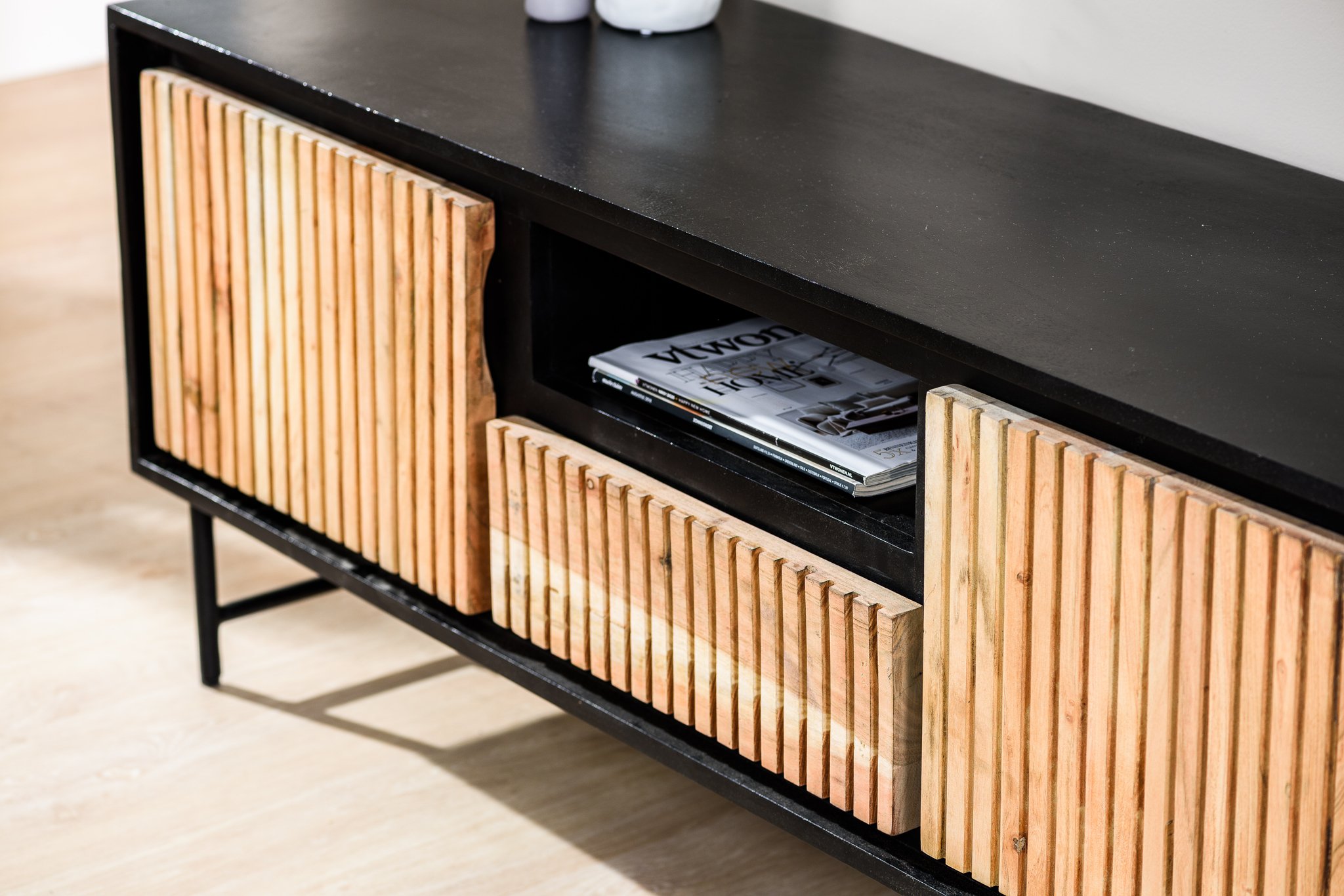 Stijlvol en stevig tv-meubel, ideaal voor een industriële look met voldoende opbergruimte en stabiliteit. Goede keuze.