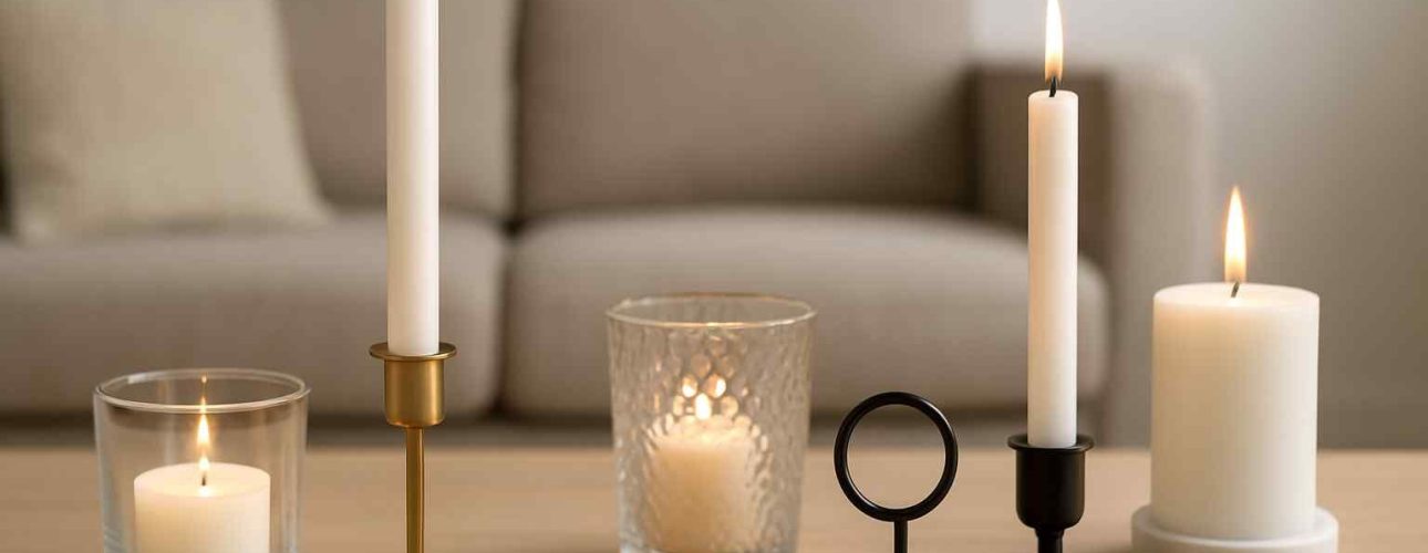 Kaarsen en houders samen creëren een warme sfeer die elke ruimte anders laat aanvoelen.