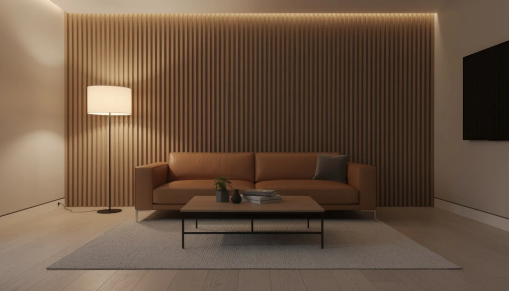 Strak gezaagde wandpanelen vormen een luxe basis voor een modern interieur. Combineer ze met designbanken, eettafels van massief hout en sfeerverlichting voor een ruimte die écht indruk maakt.