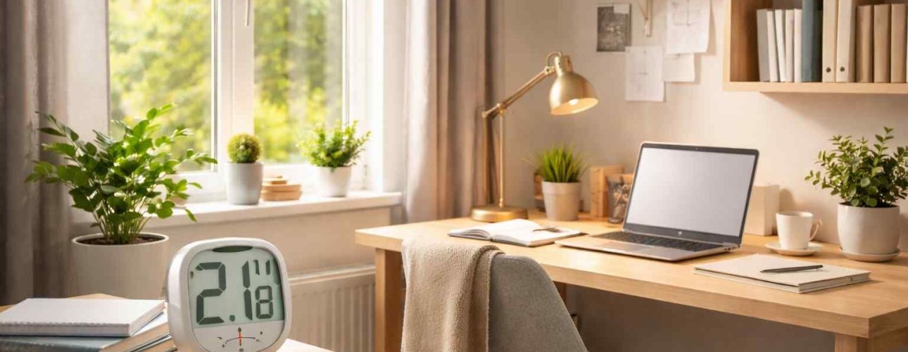 De ideale temperatuur in huis is niet in elke ruimte hetzelfde. Voor concentratie is de kamertemperatuur vaak net iets lager dan in een woonkamer: een lage temperatuur helpt om fris te blijven, terwijl een hoge temperatuur sneller slaperig maakt. Veel mensen ervaren de ideale kamertemperatuur in een studeerplek rond 21 graden, terwijl 22 graden fijn kan zijn als je lang stilzit of snel afkoelt.