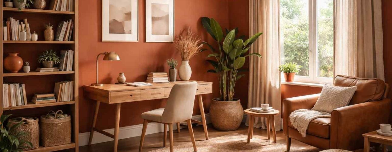 In een studeerkamer werkt dit extra goed: je wilt comfort, maar ook concentratie. De warme tinten geven net genoeg energie, zonder onrust. Terracotta geeft daarbij een zachte, omhullende sfeer die je helpt om langer prettig te werken.