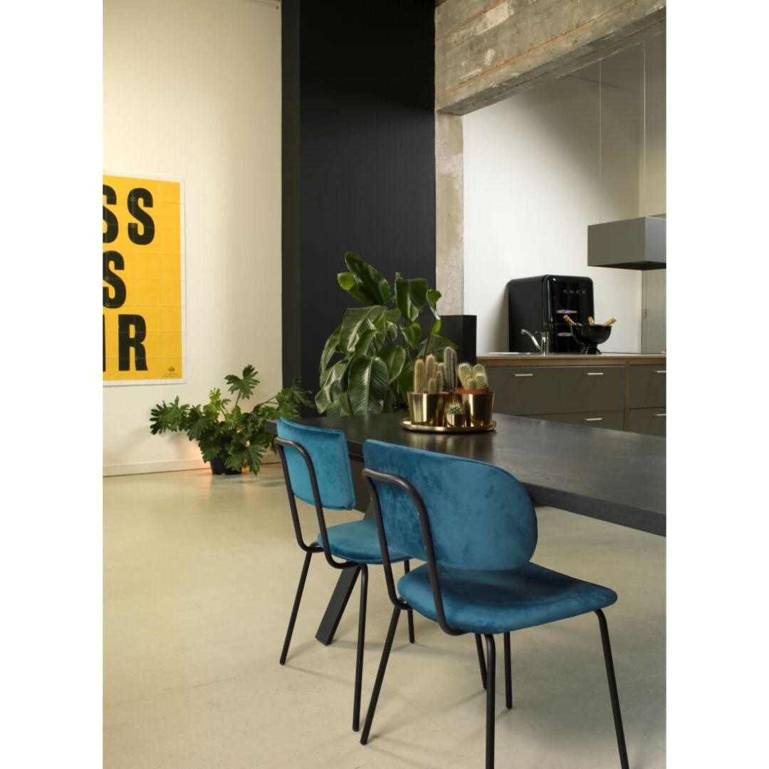 Deze eetkamerstoel komt goed tot zijn recht aan een moderne eettafel. De brede zitting en zachte velvetstof zorgen voor comfort, terwijl het metalen frame stabiliteit biedt. Het stapelen gaat vlot. Minder geschikt bij beperkte opbergruimte. Ideaal voor stijlvolle interieurs.